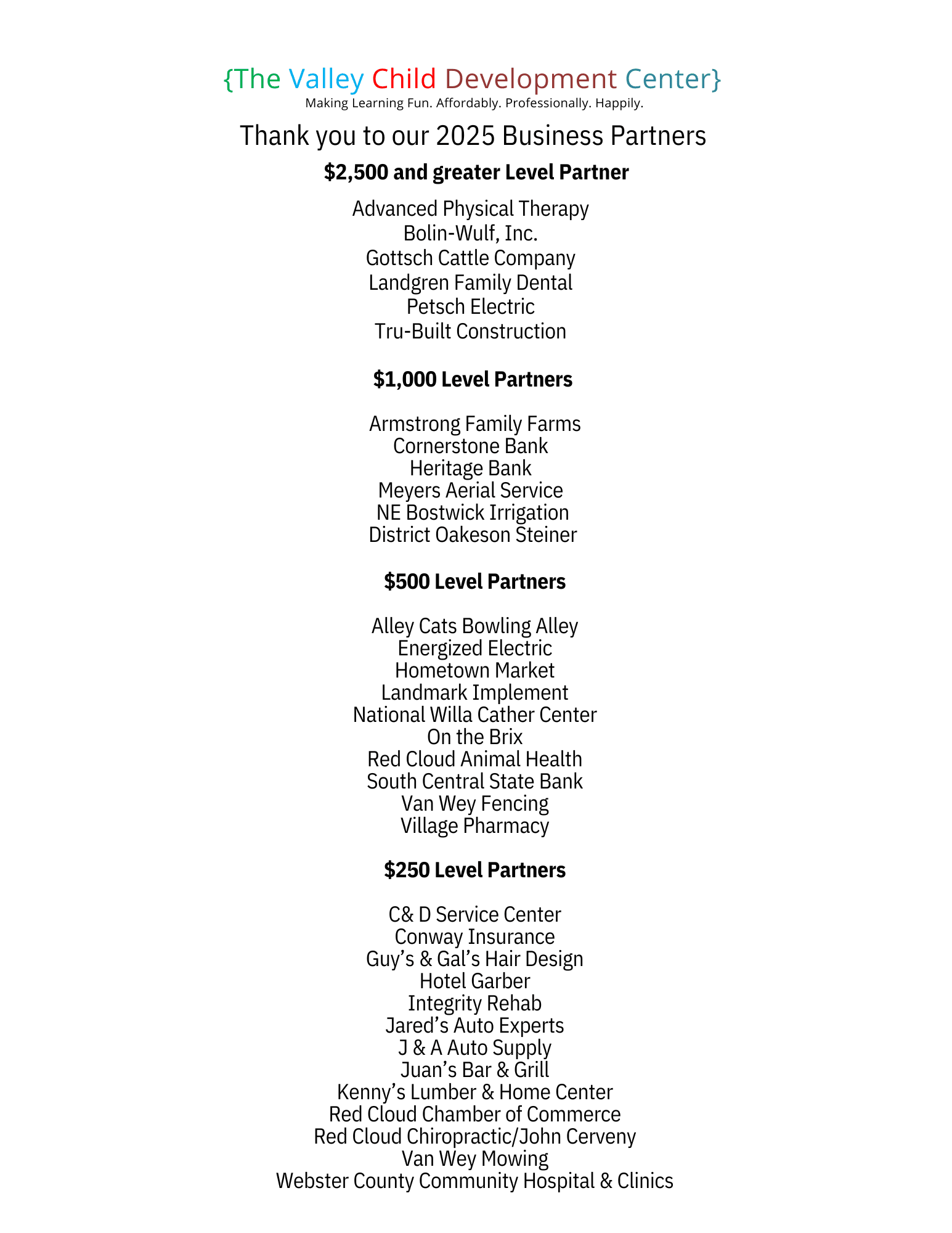 The Valley Child Development Center appreciates Our Community’s Businesses Supporting Our Community’s Children for Our Community’s Future and looks forward to additional business partners in the future. If your business is interested in becoming a partner with TVCDC please contact Director Anissa Sauceda at (402) 746-5110 or e-mail thevalleychild@gmail.com.